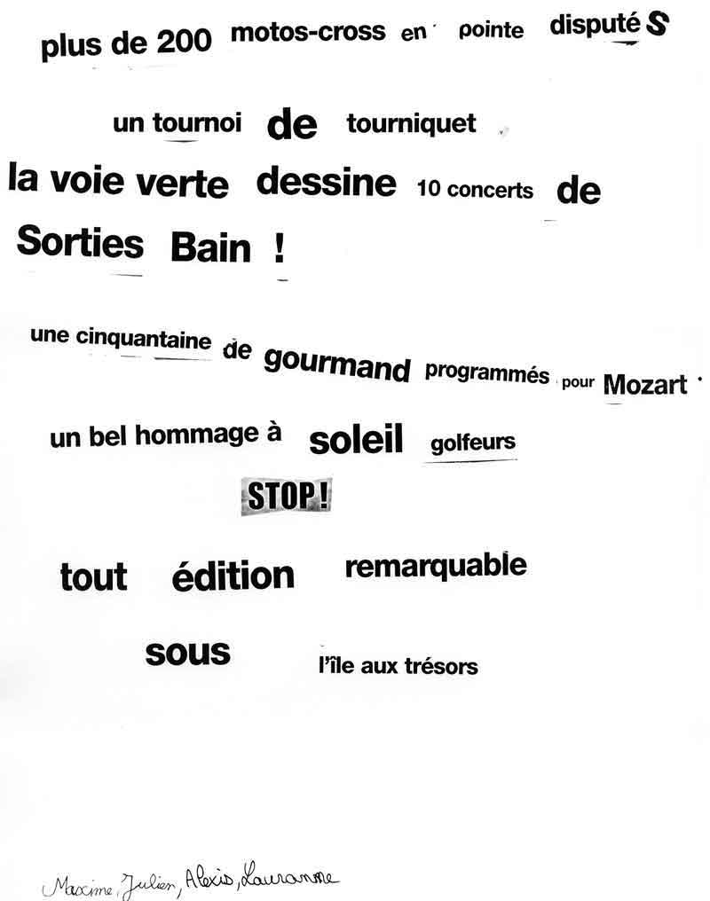À la suite d'une présentation (succincte mais prolongée en arts-plastiques) du mouvement surréaliste et après un travail réalisé sur Queneau, nous nous sommes intéressés à la création poétique à partir de collage d'extraits de journaux comme le faisait Dédé.